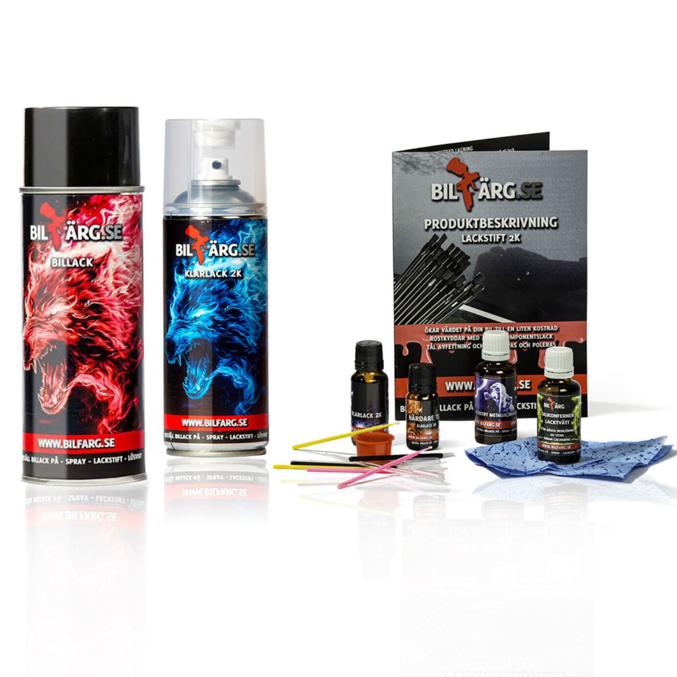 Välj mellan 2-komponent sprayfärgspaket eller 2-komponent bättringsfärg-kit – båda alternativen ger dig ett hållbart och långvarigt skydd för din lack. Bättringsfärg är samma sak som lackstift, och är perfekt för att snabbt laga mindre skador och repor.